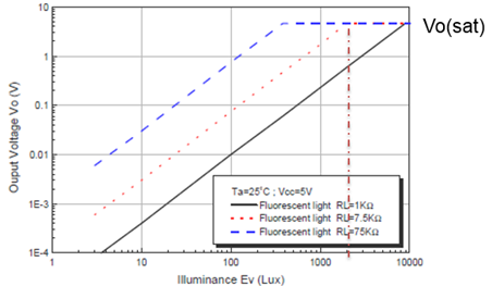 以下圖3 RL = 7.5k ohm 曲線為例,適合最大操作環境光 1100Lux 以下。請注意 0 Lux 時會有極小 的暗電流(Dark current)輸出使得最小輸出電壓不是 0 V,此暗電流會隨著溫度上升而增加(此趨勢可參考規格書),故一般在低照度(10Lux 以下) (註 5)且高溫(60℃以上)的情況下,照度的判斷跟 25℃時相 比會有誤差。ALS 輸出飽和電壓 Vo(sat)小於供應電源 VCC。