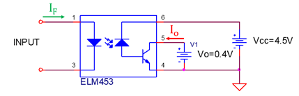 邏輯電路中,常會因靜電或磁場的干擾,進而在線路上感應出電壓,此種不屬於原電路 的訊號即為雜訊,而抵抗此雜訊的能力,稱為雜訊容忍度(Noise margin)。如圖 3 所示。在 電路設計上,ELM453 Vo(pin5)的輸出電壓VOH,應高過於 Receiving Device 的VIH,並且 VOL低於VIL,才能正確的判斷訊號。