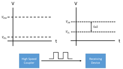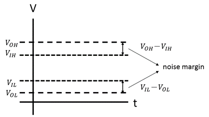 2.邏輯電壓 : 在數位傳輸中,訊號用高、低電壓來表示邏輯訊號的 1 和 0。如圖 2 所示,輸出電壓的規範以VOH和VOL表示,VOH定義為邏輯 1 的最低輸出電壓,VOL定義為邏輯 0 的最高輸出電 壓;輸入電壓的規範以VIH和VIL表示,VIH定義為邏輯 1 的最低輸入電壓,VIL定義為邏輯 0 的 最高輸入電壓。