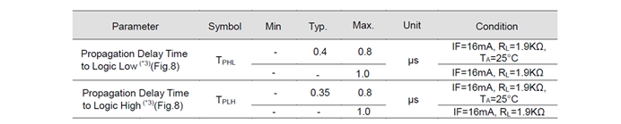 3.傳播延遲時間(Propagation delay) : 輸入訊號經過光耦轉換,會延遲一段時間後,輸出訊號才會反應,TPHL表示輸出訊號的電壓從高準位降至低準位的時間,TPLH表示輸出訊號的電壓從低準位上升至高準位的時間。 如表格 2 所示,測試條件為IF=16mA、RL=1.9KΩ。圖 4 為測試電路及各參數定義的時間 軸。