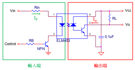 - 輸入端:以 Control pin 控制 NPN 電晶體,將訊號以光的方式傳送至輸出端。