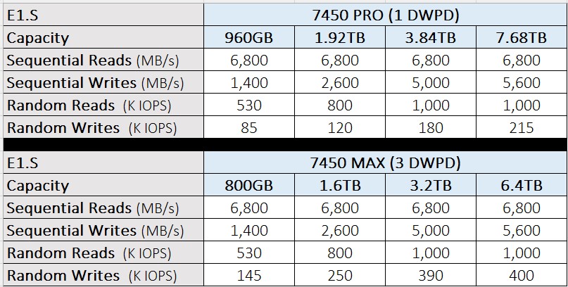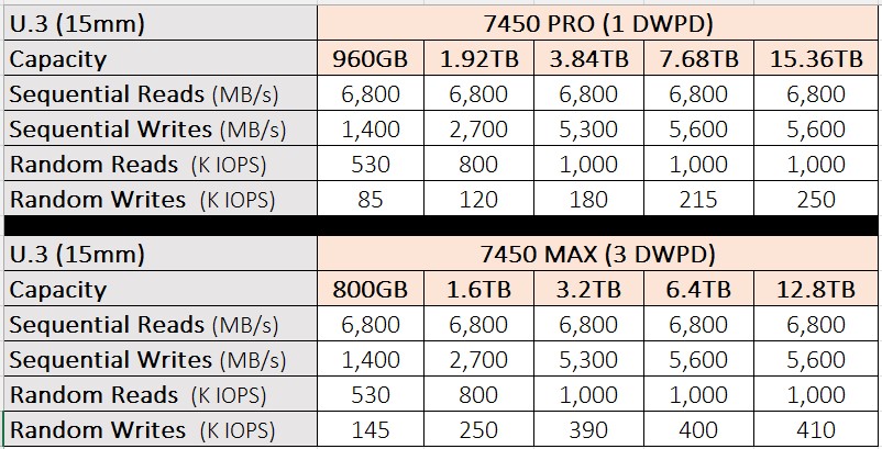 - 容量、外形尺寸: 7450 SSD 提供的一系列容量,從 400GB 到 15.36TB,並具有業界最廣泛的外形規格,包括 U.3、M.2 和 E1.S。 也是業界唯一提供 15mm 和 7mm 規格的 PCIe Gen4 U.3 SSD,此外還有業界領先的 7.68TB E1.S 選項。 這些選擇有助於滿足數據中心快速變化的電力和熱需求。