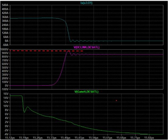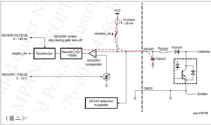 在大部分避免電壓過壓的設計中,大多使用Active clamp 的傳統設計,如(圖一)所示,D1/D2避免VCE/VDS電壓過衝,一旦過衝經由D4返回Gate,藉此避免過衝損壞IGBT/SIC,而我們也支援這種方式使用CLAMP PIN 達成,但此方法使用非常多的二極管導致沒有效率而且昂貴,因此,GD3160提出另一種節省成本的方式,可以參考分段驅動電路如(圖二)所示,在正常操作期間,關斷IGBT/SIC時,GD3160會打開電流約20mA來充電CDESAT,根據通過功率元件的電流量,我們可以檢測到一個閥值,這就是分段驅動的閥值,一旦超過比較器,並持續一個可編程的延遲時間,GD3160會進入SSD。目的是減慢關閉的時間,而不使用GL pin關閉,在很短的時間內約300ns至600ns內我們打開SSD,以減少VDS或VCE上的過衝。