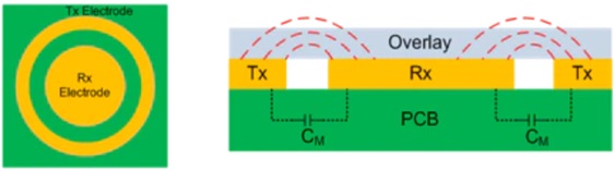 互電容測量兩個電極(發射 (Tx) 和接收 (Rx) 電極)之間的電容 (CM).