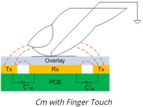 當手指放在 Tx 和 Rx 電極之間時, CM 會減小. 電容感應系統測量 Rx 電極上接收到的電荷量, 以檢