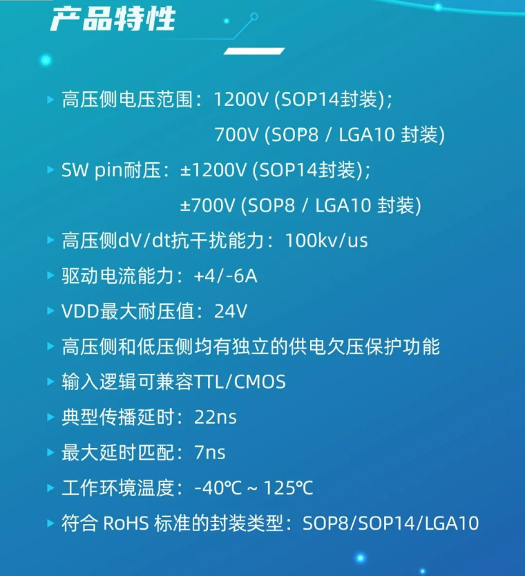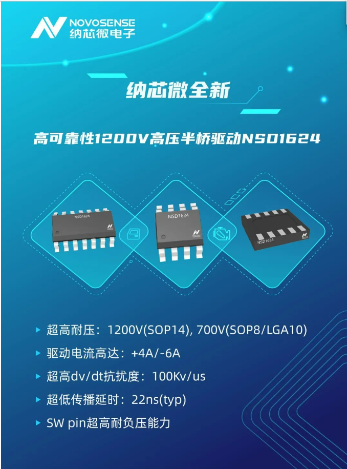 NSD1624輸入邏輯可兼容TTL/CMOS,方便控制。高壓側和低壓側均具備獨立的供電欠壓保護功能(UVLO),能在10~20V電壓範圍內工作。此外,NSD1624可提供SOP14,SOP8,LGA 4*4mm多種封裝形式。