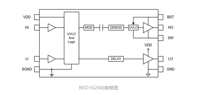 如下圖NSD1624功能框圖所示,納芯微創新地將隔離技術方案應用於高壓半橋驅動中,使得高壓輸出側可以承受高達1200V的直流電壓,同時SW pin可以滿足高dv/dt和耐負壓尖峰的需求。可適用於各種高壓半橋、全橋、LLC電源拓撲上。
