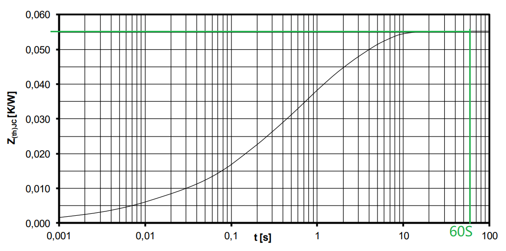 同上述125%功率過載計算方法一樣,並且由於規格書中的瞬態熱阻在60S時已經穩定,我們可以使用上述表格中的最大RthJC值來計算結溫。