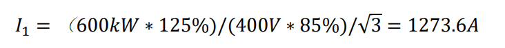 以600kW UPS,輸出電壓400 VAC旁路舉例,分別考慮下述過載規格,125%功率過載10分鐘以及150%功率過載1分鐘,並且以85%輸出電壓作為最惡劣條件。