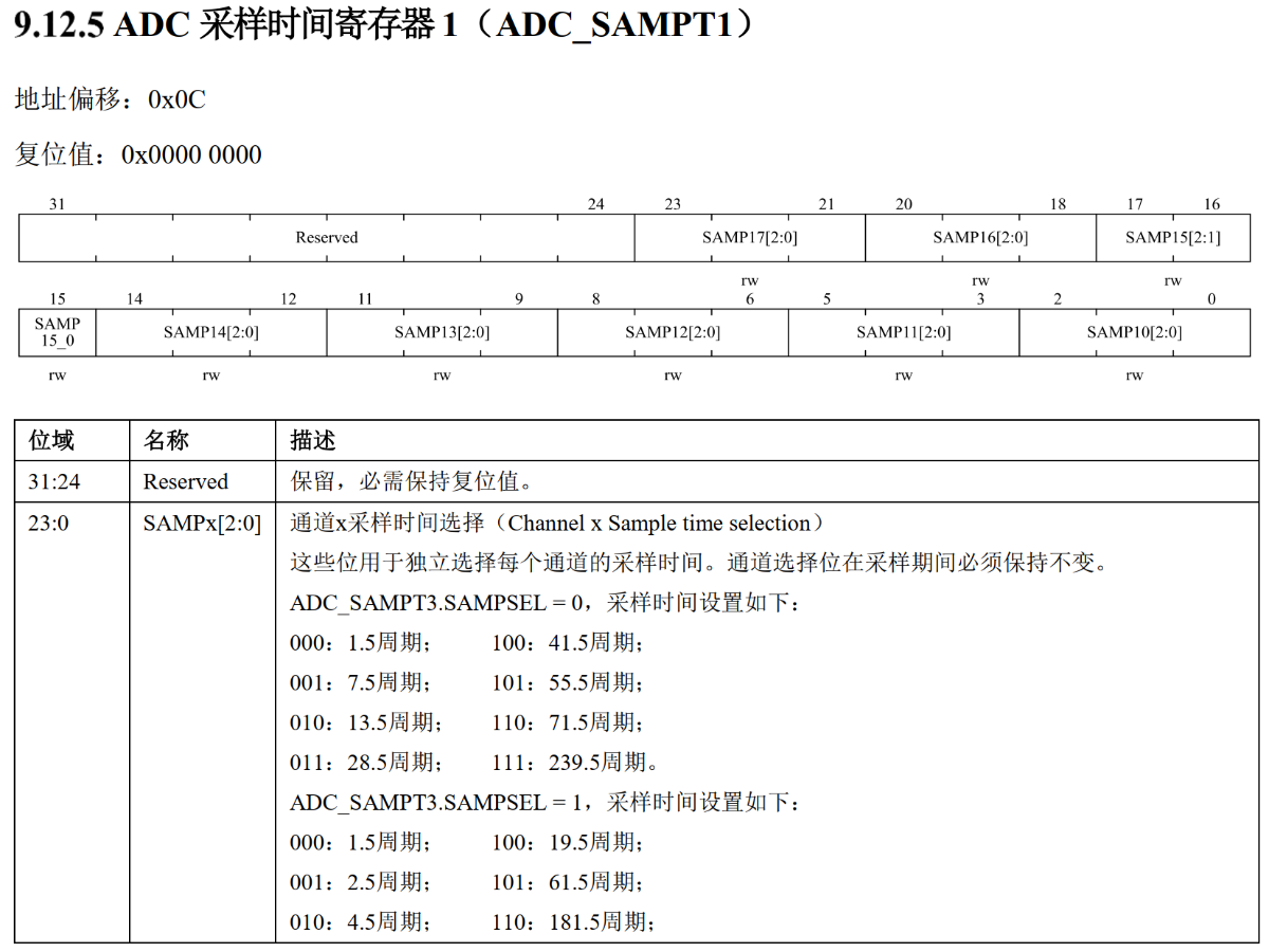 可以在 ADC_SAMPTx.SAMPx[2:0] 寄存器中修改採樣時間: