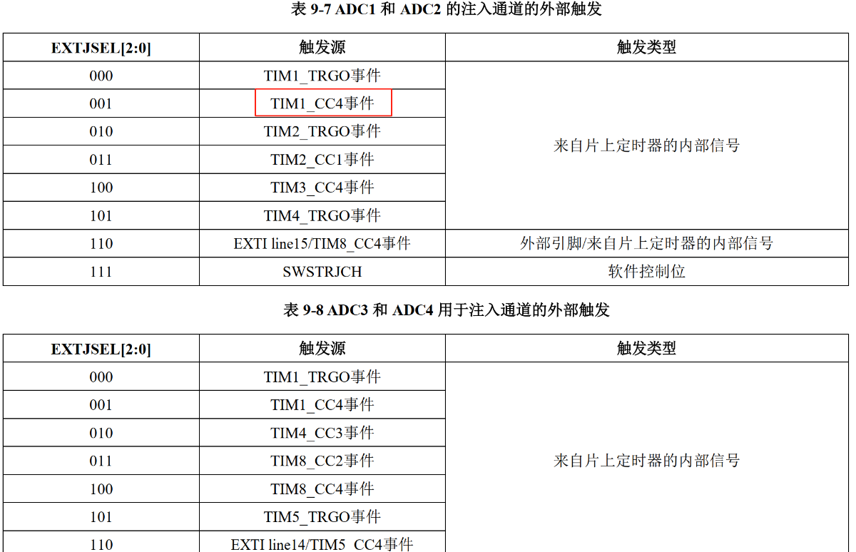一般是外部引腳的上升沿或者內部 Timer 的匹配觸發,需要注意的是規則通道與注入通道的 Timer 中斷有所不同,比如 ADC1 ADC2 注入通道的觸發源,注入通道 TIMER1 觸發只支持 CC4 觸發,而規則通道可以 CC1 CC2 CC3 觸發。