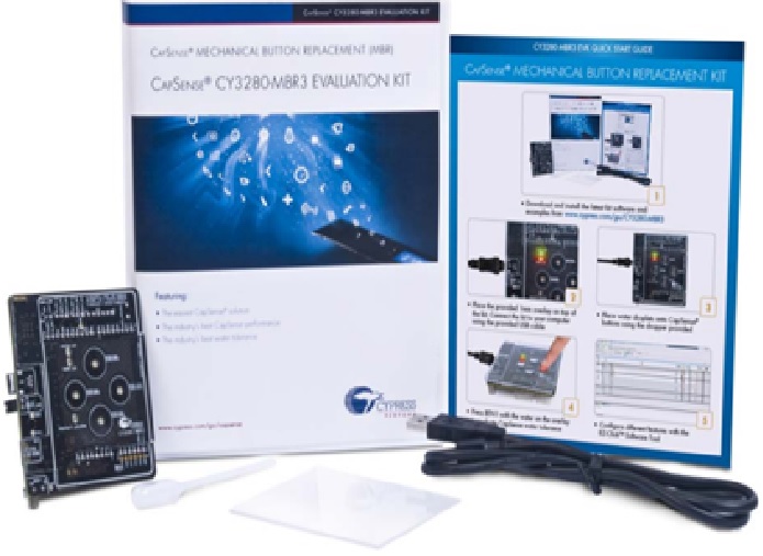 CY3280-MBR3 CapSense™ MBR3 評估套件中都包含一個滴管, 供用戶將水滴到塑料覆蓋層上, 以檢查和評估 CAPSENSE™