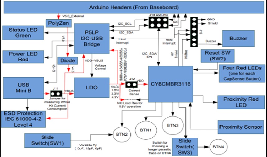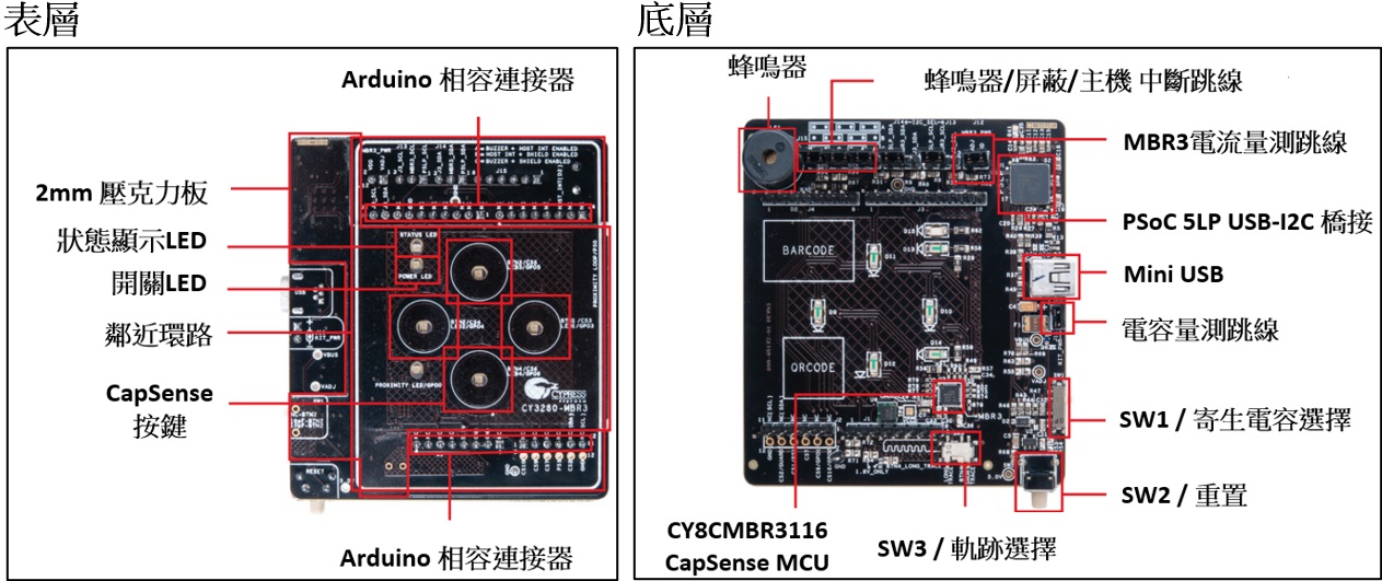 CY3280-MBR3 EVK 包括一個狀態綠色 LED、一個電源紅色LED 以及與所有 CapSense 按鍵相對應的 LED跟1KHz的蜂鳴器,以及與套件上的鄰近環路相對應的LED. 它包含一個板載PSoC 5LP, 充當 USB-I2C 橋接器, 支持使用 PC 主機進行 I2C 通信, 該套件還包括一個寄生電容選擇 (SW1)做驗證、重置按鈕 (SW2), 該按鈕連接到 CY8CMBR3116 的複位引腳 (XRES)設備以及軌跡選擇(SW3)做驗證. 設備所有未使用的引腳都引出到套件上的 Arduino 接頭 J2 上, 以使您能夠測試不同類型的自行設計的傳感器並在示波器上輸出觀察.