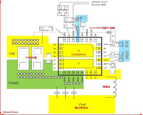 以AOS所推出AOZ22557QI為設計範例,其整合式降壓本體包裝為4mm×4mm QFN-30L package,包含周邊元件的設計,可實現於16mmx16mm PCB 面積內將一完整降壓電路設計與佈局完成: