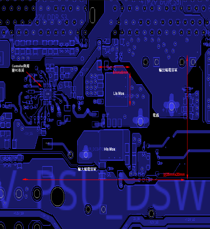 - 分離式設計降壓電路設計的佈局來看,就算選用目前最小包裝的單體Mos 也要3mmx3mm 兩顆再外加上Controller與其周邊線路以及降壓電路所需電感元件等等,也極難滿足在極小的空間中完成電路的設計與PCB佈局.所需空間25mm*20mm.