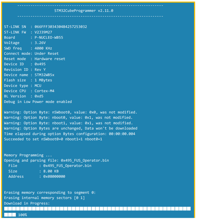STM32_Programmer_CLI.exe -c port=swd mode=UR -startfus -fwupgrade "C:\Users\zhaomaso\STM32Cube\Repository\STM32Cube_FW_WB_V1.14.1\Projects\STM32WB_Copro_Wireless_Binaries\STM32WB5x\stm32wb5x_FUS_fw.bin" 0x080EC000 -HardRst -fwupgrade "C:\Users\zhaomaso\STM32Cube\Repository\STM32Cube_FW_WB_V1.14.1\Projects\STM32WB_Copro _Wireless_Binaries\STM32WB5x\stm32wb5x_BLE_Stack_full_fw.bin" 0x080CE000 -HardRst -d "C:\Users\zhaomaso\STM32Cube\Repository\STM32Cube_FW_WB_V1.14.1\Projects\P-NUCLEO-WB55.Nucleo\Applications\BLE\BLE_HeartRate\EWARM\BLE_HeartRate\Exe\BLE_HeartRate.bin" 0x08000000 -HardRst