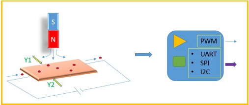 當導體通電後放入磁場中,由於磁場的作用導體上流動的電荷就會因為受到由磁場感應產生的洛倫茲力而發生流通路徑的偏移,這樣在垂直於電流方向上如果去測量的Y1,Y2點電壓,將產生電勢差,這個就是所說的霍爾效應;如果使用ADC對Y1,Y2點進行測量標定即可以反推磁場變化;