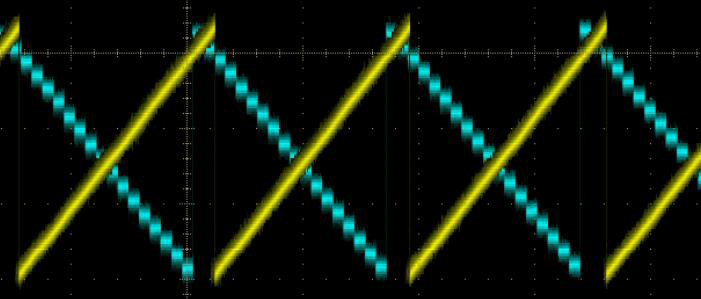 程序修改完成後編譯下載,讓電機工作在無傳感閉環模式,示波器連接DAC兩路輸出。
