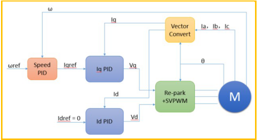 以表貼電機為例,一般的FOC電機控制是兩環控制,速度環+電流環的控制方式,速度環為外環,電流環為內環,Idref = 0(d軸電流參考為0)的控制為常見控制;參考速度環輸出參考轉矩後供後端電流環路;