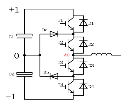 1. 在INPC三電平拓撲結構中, 每相的功率元器件總共有6個, 4個IGBT: T 1, T 2, T 3, T 4以及2個鉗位 極管二極體: Da, Db。2.4個I G BT的開關狀態組合可以組成不同的模態。