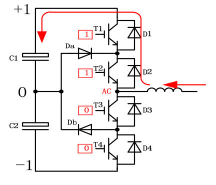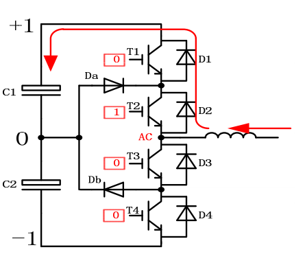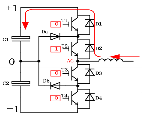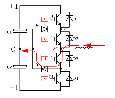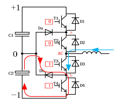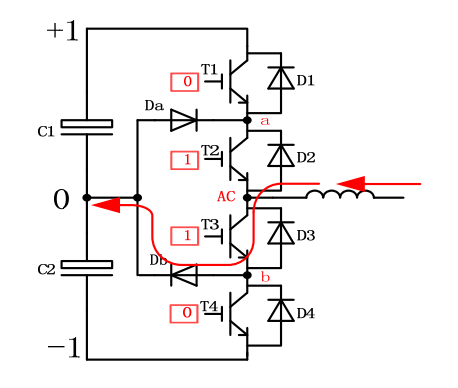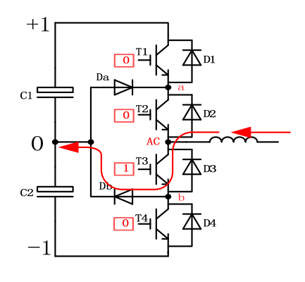 在這個時刻,T4開通, b點電位被拉至‐ 1, Db被強迫關斷,Db會出現反向恢復行為。換流的電流如右圖所示, 電流穿過C2, Db, T4以及其中的雜散電感。這是小換流迴路。