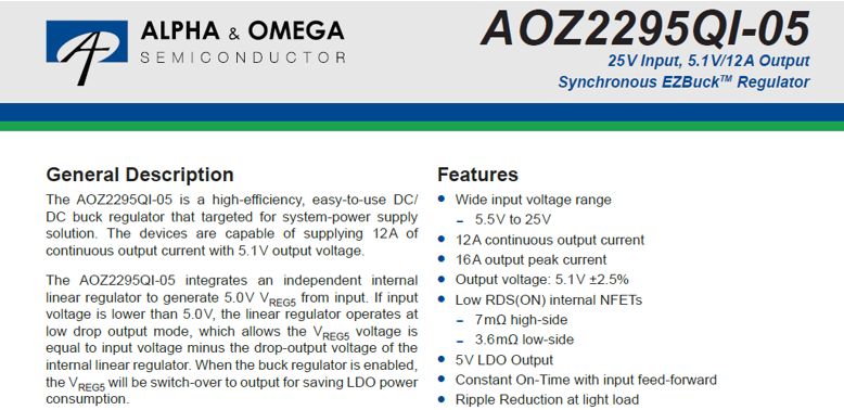ANS: AOZ2295QI-05 具有外部軟啟動功能來限制突波電流並確保輸出電壓斜坡上升平穩地調節電壓
