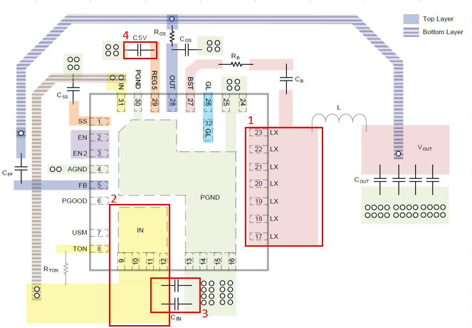 - Feedback走線等敏感訊號走線應遠離 LX 接腳。