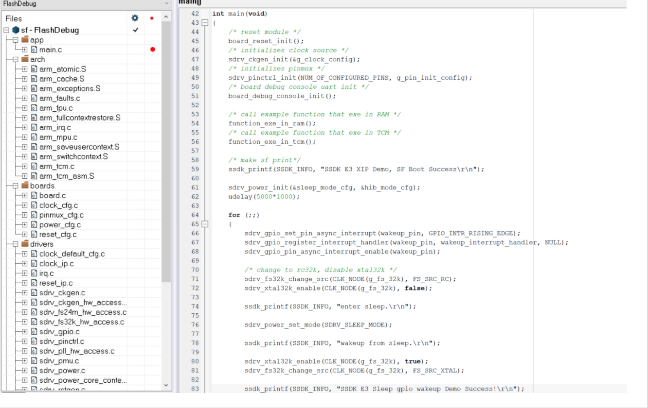已知客戶問題:基於 SSDK3.0 使用 sleep_gpio_wakeup demo 可以正常休眠喚醒,將 sleep_gpio_wakeup demo 中休眠喚醒相關的代碼移植到 XIP 的 sf demo 工程中,可以休眠但是無法正常喚醒。板卡:E3104。代碼: