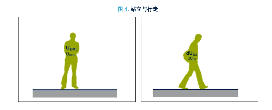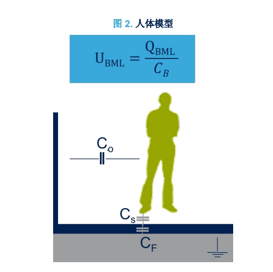 下文以人體運動為例進行介紹。行走、跑跳等人類日常行為會產生靜電,因此人體本身自帶電位 (U)。這種靜態電位變化在幾毫秒內消失,因為人體通過空氣 (Cx) 或鞋底 (Cs) 和地板 (CF) 與大地之間存在耦合電容。下圖顯示了一個站立的人和一個行走的人,分別標有相應的電位和電荷術語,圖片下方包含這些術語的解釋。