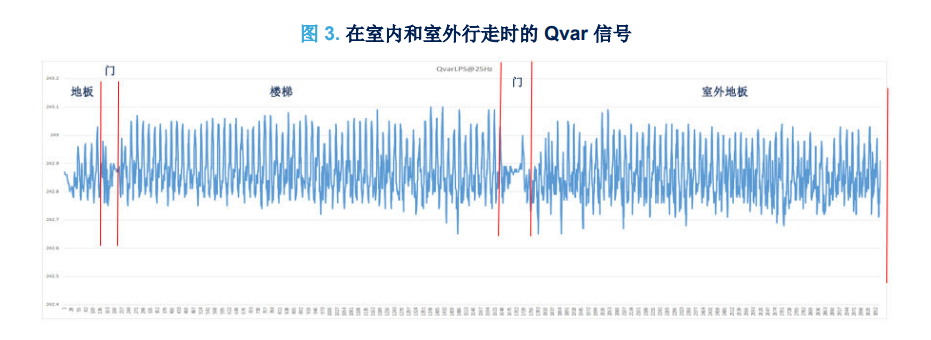 下圖顯示了人體佩戴電極(不接觸皮膚)的情況下連續行走時的 Qvar 感應信號。