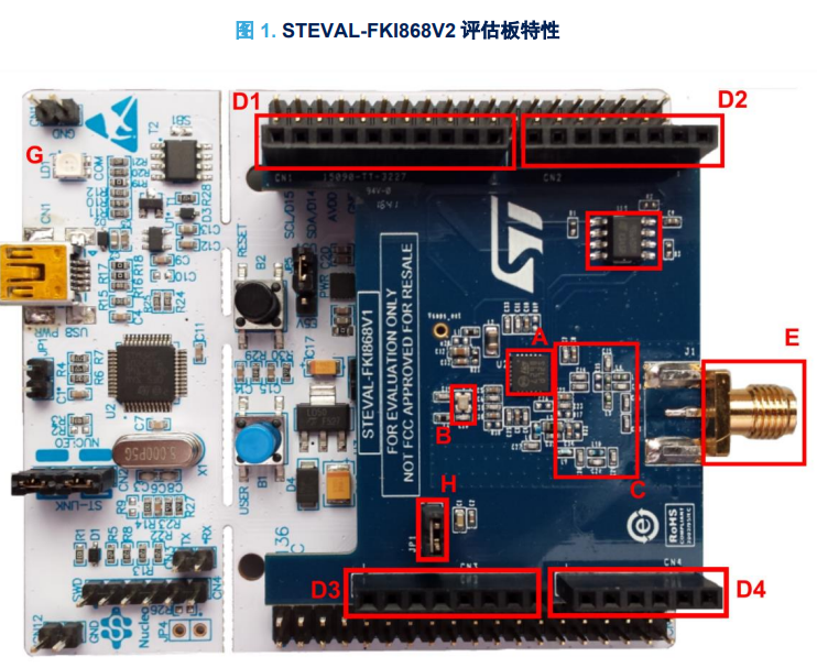 STEVAL-FKI868V2、STEVAL-FKI433V2 和 STEVAL-FKI512V1 評估板分別設計用於 826-958 MHz、413- 479 MHz 和 452-527 MHz 的工作頻段。 板上的一些功能如下(參見圖 1.STEVAL-FKI868V2 評估板特性):