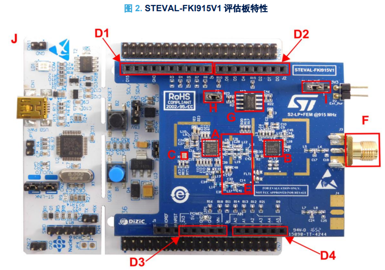 STEVAL-FKI915V1 評估板經過調整,可在 904-1055 MHz 的頻段下工作。 STEVAL-FKI915V1 評估板特性(參見圖 2. STEVAL-FKI915V1 評估板特性):