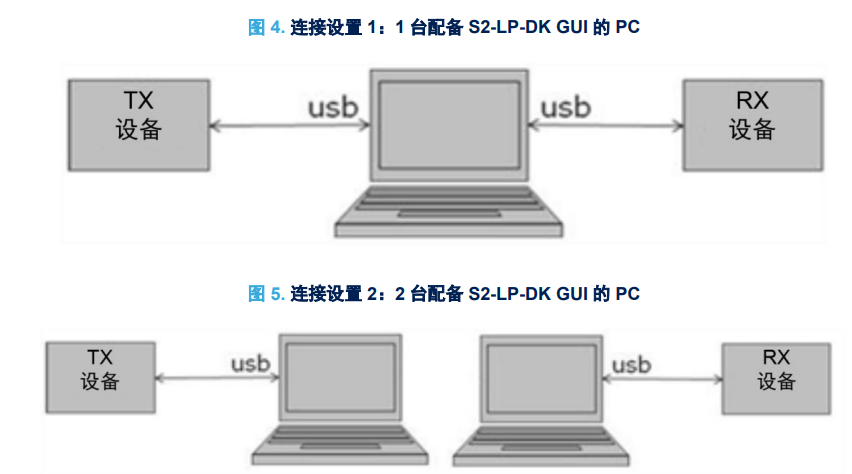 S2-LP DK GUI 僅可使用一個通過 USB 線連接到 PC 的 S2-LP DK - 母板以及 S2-LP RF - 子板。 因此,連接到PC的每個板子,只能運行S2-LP DK - GUI 的一個實例。 圖 4. 連接設置 1:1 台配備 S2-LP-DK GUI 的 PC 和圖 5. 連接設置 2:2 台配備 S2-LP-DK GUI 的 PC 展示了使用一台或兩台 PC 時的典型連接。