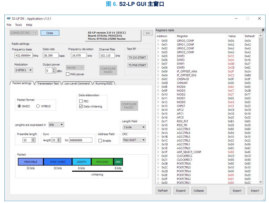 軟體包中包含的 S2-LP DK GUI 是一個圖形使用者介面,可用於與 S2-LP 裝置進行交互並評估其性能。 您可點擊桌面上或者:開始 →STMicroelectronics →S2-LP DK X.X.X →S2-LP DK 下的 S2-LP GUI 圖示,運 行此實用程式 該版本的 GUI for S2-LP 專門針對 RF 性能評估,並僅提供 RF 測試視窗和設備設定參數操作。