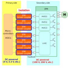 如下圖所示的逆變器應用中,控制單元(如微控制器)通常在低直流電壓下工作。而另一方面,IPM和IGBT將驅動高電壓負載(比如需要200V交流電)。高壓系統部件可通過耦合器直接由微控制器控制。