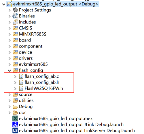 (1)在 MCUXpresso 下導入任意工程,這裡以 evkmimxrt685_gpio_led_output 例程為例,打開後將 Flash_config 下的文件更換為 QSPI 的 Flash_config 文件: