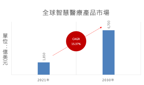 來自於市場調查機構 Verified Market Research 公司提出的 2023 年智慧醫療調查報告,於 2021 年智慧醫療產品市場規模為 1,850 億美元,預計在 2030 年將成長到 6,700 億美元,自 2023 年至 2030 年 CAGR 為 15.37%。會有這樣的成長是因為人們對於遠距離監測的需求不斷增長、智慧醫療產品提供更高價值的效益以及人口老化帶動全球智慧醫療產品的市場發展。智慧醫療產品提升了醫療服務品質與使用者體驗,讓使用者可以隨時了解自己的身體狀況。由於人們已經漸漸接受物聯網產品的操作,因此智慧醫療產品的市場將預計迅速擴大。