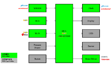 世平代理了 NXP 的跨界 MCU 與低功耗 BLE、Winbond 的 Flash 與 SDRAM,可應用在醫療產品中。除了可以偵測血壓外,搭配藍芽,可將數據傳送至手機,使用者就能透過手機查看歷史數據。以下是藍芽智慧血壓計的參考設計: