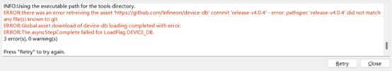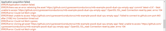 這間接導致了ModusToolbox™官方的產品開發資源無法按通常方式提供給中國大陸用戶,於是他們在使用ModusToolbox™時,會在不同的時機、不同的層級、不同的功能組件中,直接或間接地遇到與網絡訪問相關的錯誤或警告,如圖01和02。