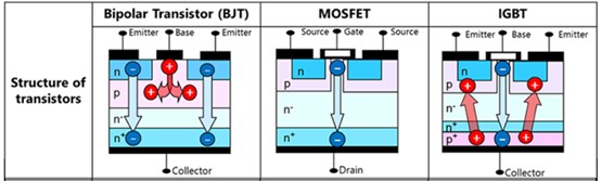 根據結構的不同,三端子電晶體大致可分為雙極電晶體(BJT)、場效應電晶體(FET)和絕緣柵雙極電晶體(IGBT)。它們的主要區別在於內部端極和PN結的構造。