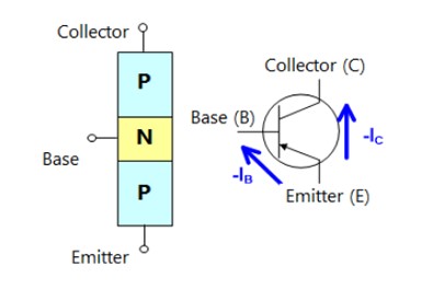 雙極電晶體有兩種類型:NPN型(左圖)和PNP型(右圖),在這3層半導體中,中間一層為基極,外側兩層分別稱發射極和集電極。它具有放大信號的功能。NPN型產品涵蓋了低耐受電壓到高耐受電壓產品,而PNP型產品的電壓耐受為400V或以下,其中以耐受200V或以下為其主流產品。