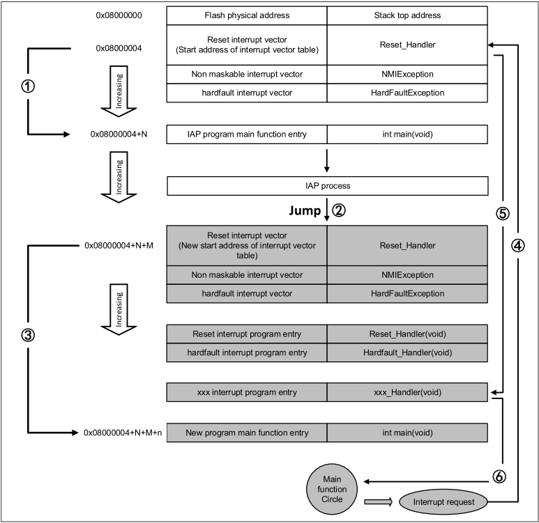 部分。新程序的復位中斷向量起始地址為 0x08000004+N+M),跳轉至新寫入程序的復位向量表,取出新程序的復位中斷向量的地址,並跳轉執行新程序的復位中斷服務程序,隨後跳轉至新程序的 main 函數,如圖標號②和③所示,同樣main 函數為一個死循