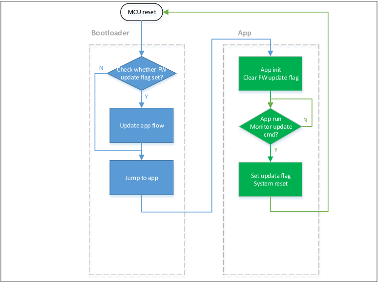 IAP 分為 Bootloader 和 App 兩部分,應用在 App 中執行,升級過程在 bootloader 中執行。程序執行整體流程框圖如下: