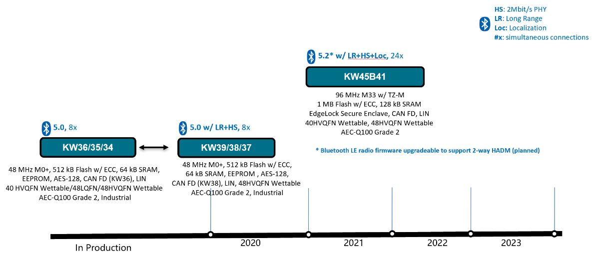 相比前幾代 BLE 產品,恩智浦在最新的 KW45 系列中增加了多種系列以支持不同的汽車應用場景,客戶可選擇不同 Flash/RAM 的 Part Number,可自由選擇是否集成 CAN。多種組合選擇也使得 KW45 在選型商可以更靈活~