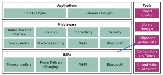 如圖01中藍色箭頭所指,Eclipse IDE和partner IDEs都只是ModusToolbox™中定義的Tools中的一種,而非ModusToolbox™生態的中心。並且,ModusToolbox™中對Eclipse這個組件的實際稱呼,也只是“Eclipse IDE for ModusToolbox”。