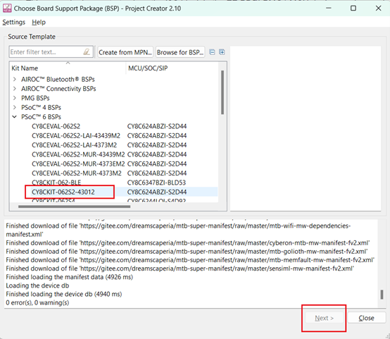 在Project Creator中,第一步先選擇你開發板對應的BSP(Board Support Package)。為方便創建HelloWorld例程,我們選擇PSoC™ 6 BSPs中的CY8CKIT-062S2-43012,選中後點擊“Next >”按鈕進入第二步,如圖03。