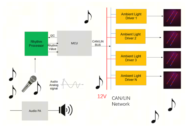 艾為電子車載“燈隨音動”方案可將音響、麥克等PA側的模擬音頻信號作為信號源。通過艾為電子高精度AFE SOC晶片——AW86803QNR-Q1對音頻信號源進行採集並轉換為數字信號。然後由艾為電子“燈隨音動”聲光同步算法對音頻數字信號進行處理從而控制燈帶隨著音樂節奏進行律動。