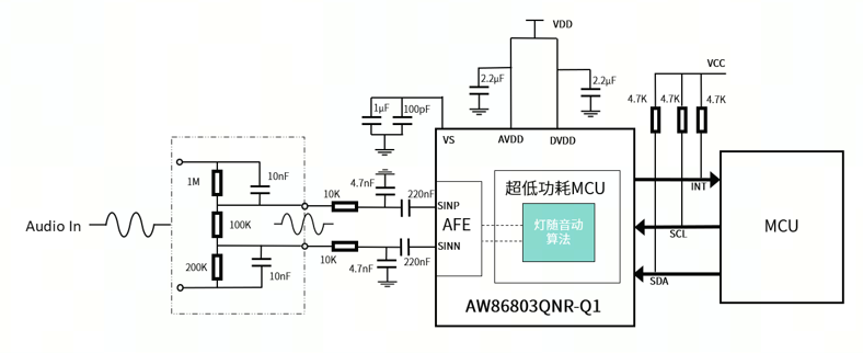 AW86803QNR-Q1是一款車規級燈隨音動SoC晶片,集成高精度ADC、兩級低噪聲PGA放大器,同時內置艾為“燈隨音動”聲光同步算法。