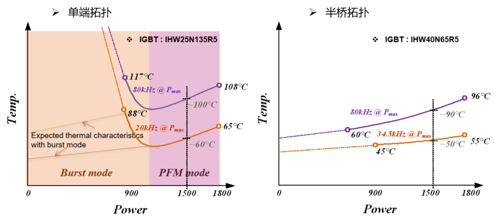 圖6.兩種拓撲功率輸出和溫升的對應關係