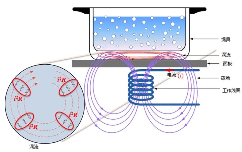 2. 在工作線圈上產生感應的磁場,感應磁場在金屬鍋具底部產生渦流;
